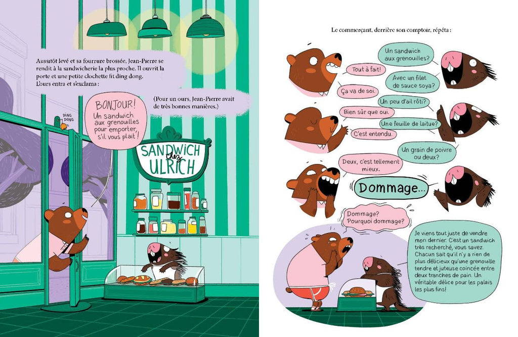 Mais tout le monde le dit: «Il n’y a rien de plus délicieux qu’une grenouille tendre et juteuse coincée entre deux tranches de pain. Un véritable délice pour les palais les plus fins!» Jean-Pierre aurait dû s’en douter. Déterminé à retrouver l’acheteur du dernier sandwich tant convoité, il mène son enquête et tombe sur dame Corneille dans son arbre haut perchée! Ah! Si seulement il trouvait le moyen de faire tomber de son bec son goûter…